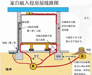 白蚁入侵房屋的三大主要途径是:分飞、蔓延、传播。家白蚁在地下活动范围有百米,可以通过土壤蔓延侵入房屋。目前,化学防治是我国房屋白蚁预防主要处理方法。
